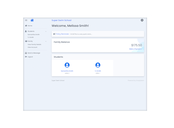 -- Seamless Customer Communication - Keep parents and students informed with SimplySwim's built-in SMS and email communication tools that send automated class reminders, schedule updates, and important announcements, enhancing customer satisfaction and reducing no-shows.