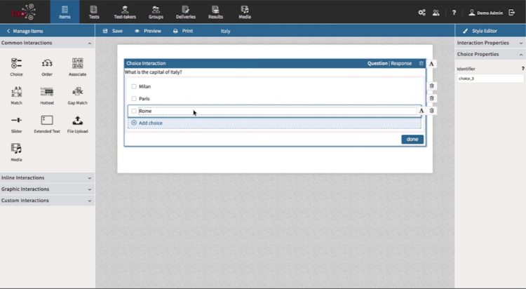 TAO Platform is an open source assessment solution that allows corporate businesses & educational institutions to create, schedule, and conduct examinations to test their employees or students. It enables users to design assessments by adding multiple items in tests as well as sort them into sections as per individual requirement.