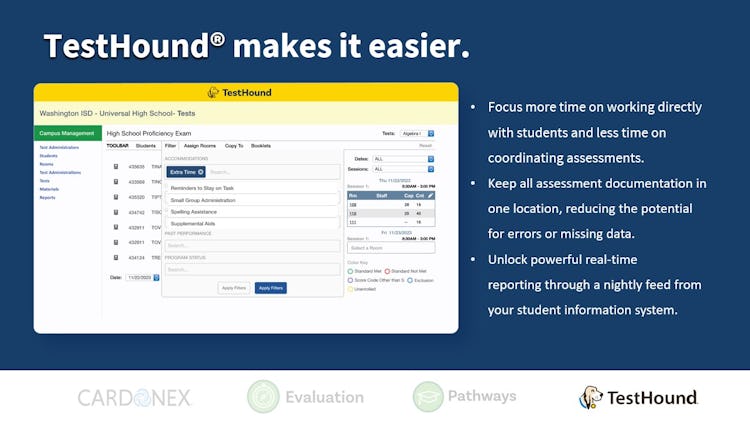 Enhance the K-12 assessment operations with TestHound, powered by Education Advanced. TestHound is a robust solution designed to streamline test coordination by centralizing student data from disparate systems into a unified platform. As educators navigate the delicate balance between the transformative power of education and operational demands, TestHound simplifies the process, making it easier for users to manage assessments efficiently.
