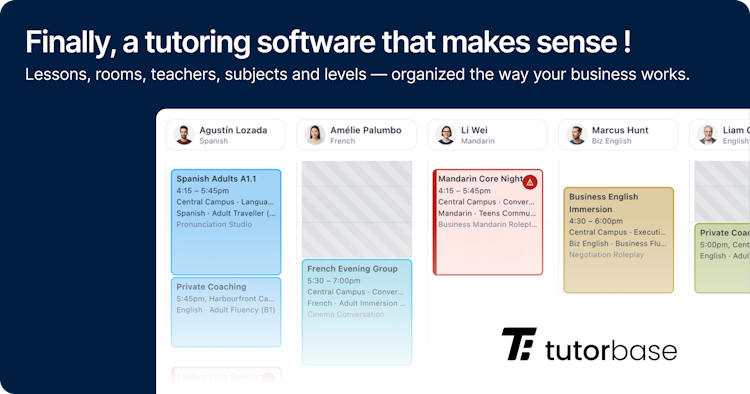 Tutorbase is the all-in-one platform for tutoring centers and language schools. Schedule lessons, automate billing, manage leads, and calculate payroll—all in one system built specifically for tutoring businesses.