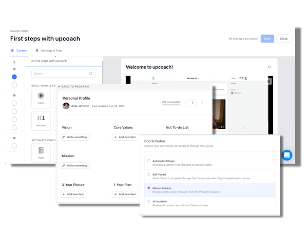 upcoach is an online coaching platform that helps individual coaches, as well as big coaching companies, deliver transformational results to their clients, and also organize and manage their business, all in one place. It lets users create courses, assign to do lists, build programs, set up agendas, conduct meetings, and more.