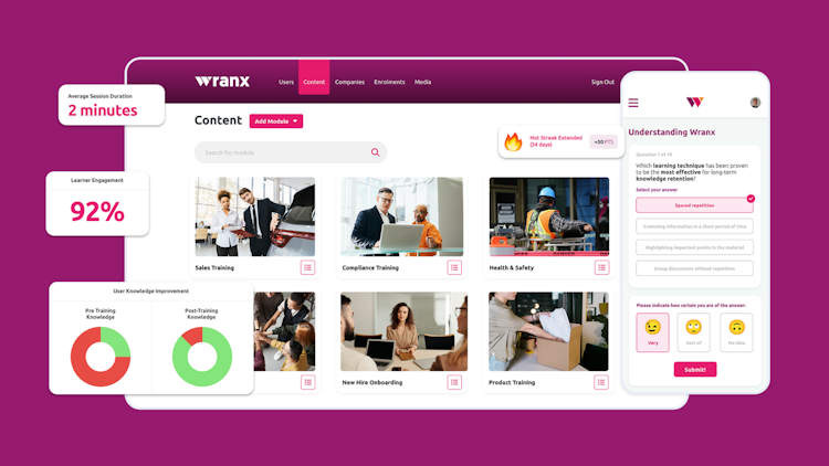 Wranx is a microlearning platform and mobile application that delivers engaging online training. It uses scientifically proven techniques like spaced repetition and certainty-based marking to help employees retain information long-term. The platform features bite-sized, interactive lessons that fit into busy schedules. These lessons keep staff motivated with game elements, ensuring they stay focused to maximize retention of key takeaways. Assessments before and after training quantify knowledge gains.