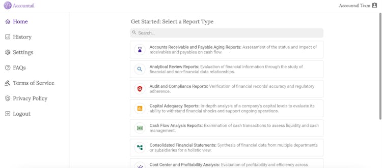 The functionality of Accountail begins with a user-friendly and intuitive file upload process that supports a wide range of file formats, including .txt, .docx, .pdf, .xls, and more. Once the necessary documents are uploaded, Accountail's advanced AI capabilities come into play, conducting thorough analyses of the data to craft a diverse array of specialized reports. These reports cover a broad spectrum, including financial analysis, performance analysis, regulatory compliance, tax audits, and other critical aspects of financial reporting.
