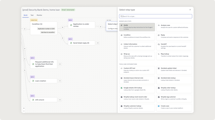 Workflow Automation & Controls: Teams can configure structured workflows using natural language inputs and rule-based logic. Automation can be tailored for use cases such as returns processing, subscription management, escalation routing, and compliance flagging.