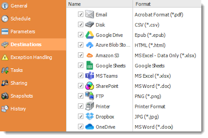 - Multiple destinations: You can send your reports to various destinations, including email, print, folders, FTP, Dropbox, SharePoint, Teams, Google Drive, and more.