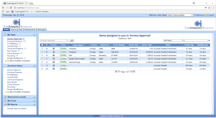 The application comes with a form designer tool, which lets users design electronic forms, add multiple fields, and link them to data sources. Accountants can use CoreIntegrator Workflow platform to capture information through optical character recognition (OCR) and automate entries into data fields. The solution allows staff members to route invoices to specific departments for approvals and manage GL distributions. Using the drag-and-drop interface, professionals can create configurable workflows, and generate a visual representation of ongoing processes to monitor activities associated with them.