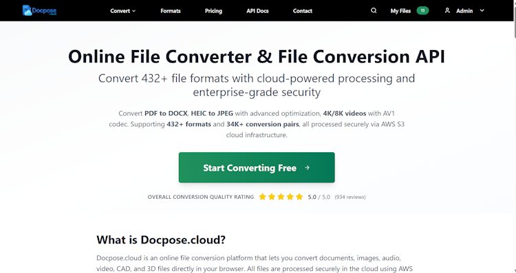 Docpose.cloud is a cloud-based file conversion and document processing platform that enables businesses and developers to convert, process, perform OCR, and extract data from digital files across hundreds of formats. The platform supports documents, images, audio, video, CAD drawings, 3D models, archive files, and many other file types.