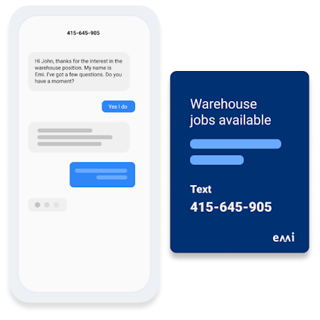 Emi enables your company to reach out to prospective candidates wherever they are, with integrations to leading online job boards, custom links for social media and paid advertising, QR codes for in-store recruitment, and more. Make applying to jobs frictionless via SMS and popular messaging apps, like Facebook Messenger and WhatsApp.