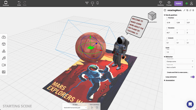 Design interactive AR using 3D models, video, audio, animations, and images. Easily link scenes, add custom animations, and personalize everything from the loading screen to the final visuals. Even green screen video is supported.