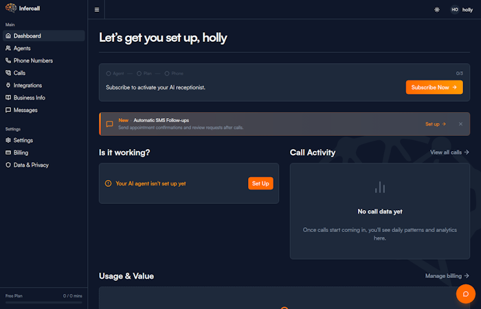 Infercall includes features for lead qualification through customizable screening questions that assess budget, timeline, location and service requirements. It facilitates appointment scheduling by integrating directly with calendars and sending automated confirmations. Call transfers include contextual summaries and SMS notifications for booking confirmations, directions and quote details. All calls are recorded and transcribed with searchable text archives accessible via a real time analytics dashboard. The dashboard displays metrics on call volume, duration, outcomes, peak periods and conversion trends. Data retention is configurable from seven to ninety days to accommodate compliance requirements and a one click deletion feature is available.