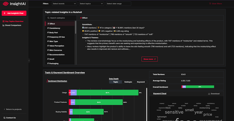 With InsightAI, businesses can gain insights about their consumer base, allowing them to tailor their brand positioning to address customer feedback, interests, needs, and challenges. The platform's competitor analysis suite continuously monitors and evaluates consumer sentiments from key market players.