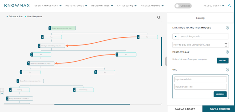 Knowmax is a knowledge management software that enhances customer support through decision tree analytics for phone and AI Chatbot communication. The system's decision tree functionality allows support agents to collaborate on customer inquiries and search for previous responses to commonly asked questions. Using the intuitive dashboard, agents can utilize the system's picture guide and knowledge base, which gives a visual explanation for incoming tickets and adds a self-service customer experience.