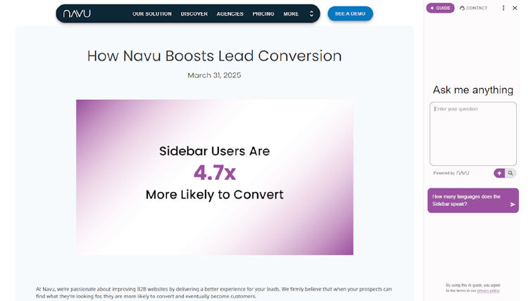 Marketing agencies benefit from special access to Navu, as eligible agencies can utilize the AI Sidebar and detailed visitor analytics at no cost indefinitely without partnership requirements or lead referrals. The platform offers multilingual support to accommodate diverse audiences and includes a straightforward onboarding process where businesses can build a custom demo in under one minute, test the AI capabilities on their own site, and access a free trial period to experience the full range of features before committing to the service.