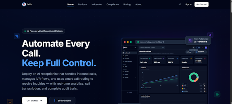 NEO is an enterprise grade artificial intelligence powered virtual receptionist and contact center automation platform designed to handle inbound call operations at scale. The software enables organizations to deploy intelligent voice agents that manage incoming calls, execute interactive voice response workflows, and implement smart call routing to resolve customer inquiries without human intervention. The platform delivers real time analytics, complete call transcription capabilities, and comprehensive audit trails for all call interactions. NEO primarily serves contact centers, legal firms, healthcare clinics, dental offices, and hospitality businesses that require round the clock call availability with stringent compliance requirements across healthcare, finance, and enterprise sectors.