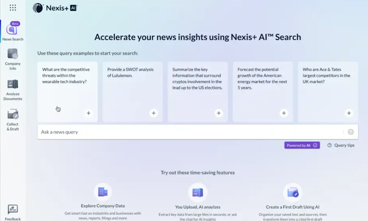 Nexis+ AI serves various professional needs including knowledge management, market intelligence, competitive analysis, business development, mergers and acquisitions research, and strategic planning. The platform contains data-rich company profiles drawn from authoritative sources including DB, Morningstar, and LexisNexis proprietary datasets, providing users with access to information on millions of companies through current and historical filings, analyst reports, earnings calls, and global news coverage. The system maintains data integrity through established publisher relationships that ensure content quality and reliability across twenty thousand licensed sources.