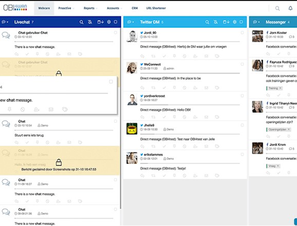 OBI Bots integrates with various social messaging applications including Twitter, Instagram and Facebook, helping businesses engage with their customers. Automatic notifications alert users to new messages with a time and date stamp. A unified dashboard allows users to manage multiple live chats, communication history, reports, media and more.