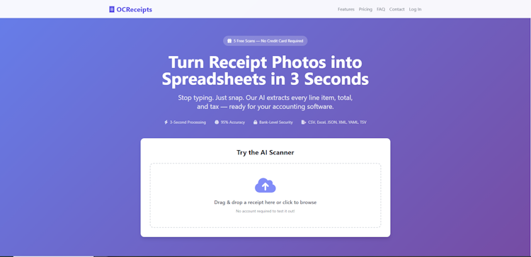 OCReceipts is an AI powered receipt scanning and data extraction application that transforms photographic images of receipts into structured spreadsheet files in seconds. The platform employs optical character recognition technology enhanced by artificial intelligence to extract merchant details, transaction dates, line items, prices, taxes, tips and totals from receipt images. It is designed for freelancers, small business owners and accounting professionals who require efficient expense tracking and streamlined financial record keeping. By automating the conversion of receipt images into exportable data files, the software eliminates manual entry and supports integration with standard accounting workflows.