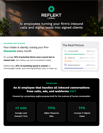 Reflekt Legal is an artificial intelligence powered intake automation platform designed for law firms that seek to standardize client acquisition processes and improve lead conversion. The software functions as an AI employee to manage inbound communications across phone calls, web forms, email, and advertising channels. The solution targets firms across diverse practice areas with challenges in response efficiency and intake consistency. Industry data indicate that about one third of potential clients fail to convert due to missed calls and that a substantial share of marketing expenditure is devoted to leads that do not receive adequate handling. The platform provides a systematic and scalable intake framework.