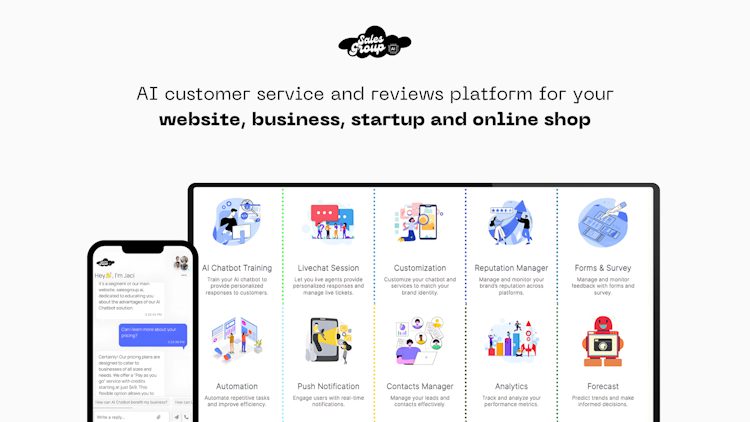 The platform also offers live chat and ticket support, interacting with website visitors and allowing seamless handover to human agents when needed. Additionally, SalesGroup AI helps businesses collect customer reviews and optimize website performance.