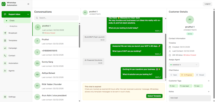 The platform deploys autonomous AI agents that execute complex customer journeys and trigger checkout processes, update customer relationship management systems and complete multi step workflows without human intervention. The system supports voice notes, media files, interactive buttons and list messages in addition to text based exchanges. It includes bulk broadcast messaging capability to distribute communications to segmented audiences. The AI agent training process accepts input from product specification sheets, frequently asked questions documents and internal knowledge base guides and requires no coding expertise to configure. Intelligent escalation protocols transfer conversations to human agents when AI uncertainty arises and preserve full context during handoffs.