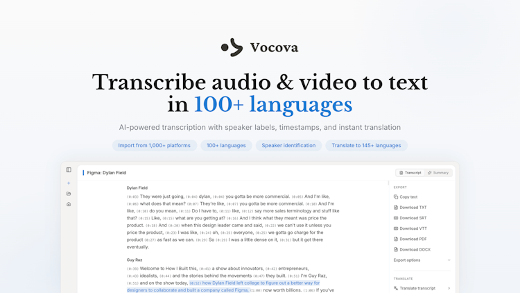 Vocova is an AI powered transcription software that converts audio and video files into text in more than one hundred languages with automated speaker identification, time stamps, and translation capabilities. The platform serves content creators, researchers, legal professionals, medical practitioners, sales teams, educators, and business professionals who require accurate transcription services for meetings, interviews, podcasts, lectures, court proceedings, clinical documentation, and sales calls. The platform operates entirely through a web browser without software installation and is accessible on desktop, tablet, and mobile devices. The service enables transcription of multimedia content from a wide range of sources.