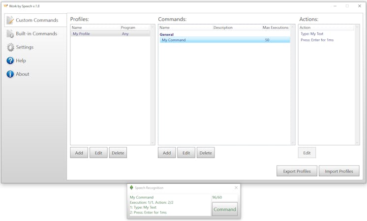 Work by Speech recognizes users' voices to control their computers and perform a variety of tasks. Without having to use a keyboard and mouse, users can dictate text, open and close programs, browse the web, and more.