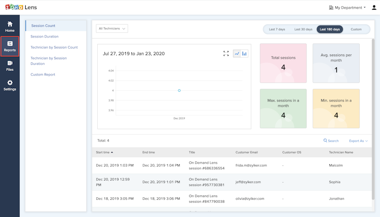 Besides better communication, Zoho Lens offers features like session analytics and recording, rebranding, and file management aid organizations in effective user management, better audits, and customization.