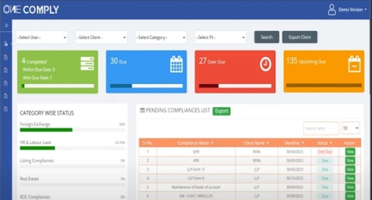 The platform features a compliance calendar that automatically populates obligations and deadlines and eliminates manual tracking processes. It also provides role based compliance mapping to assign tasks across organizational hierarchies. A user interface presents real time visibility into compliance status, pending actions and overdue items. Automated alert functionality delivers weekly reminder emails for pending and overdue obligations and expiry notifications for registrations and licenses. Certification workflows are managed through the system and regulatory circulars or updates are shared with relevant stakeholders in real time. Client portal functionality grants external parties access to designated compliance records and communications.