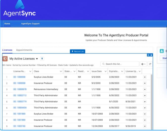 Designed for carriers, agencies, and managing general agents (MGAs), AgentSync is a compliance management solution that helps streamline onboarding, contracting, licensing, appointing, and other processes across property-casualty, life, health, and annuity insurance markets. It includes agent and self-service developer portals, transparent data and reporting, just-in-time (JIT) appointments, background checks, and National Insurance Producer Registry (NIPR) synchronization.