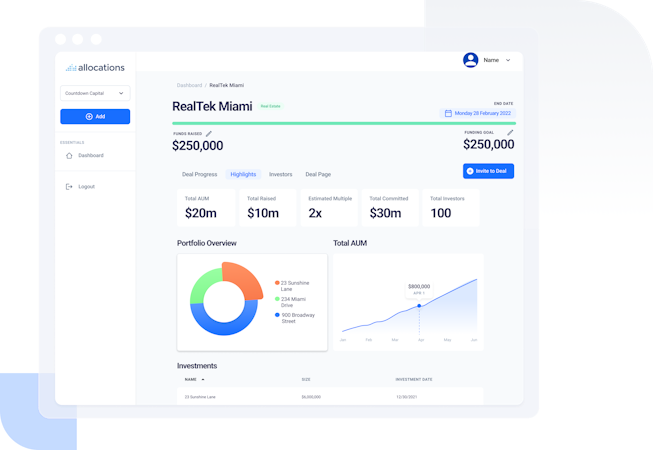 The World's Fastest Private Equity Platform, Create SPVs Instantly to Fund Your Projects. Set up SPVs and funds instantly to invest in multiple deals. Allocations provides an end-to-end fund platform that increases efficiency and empowers you to spend more time on deal sourcing & fundraising! Get investors to the finish line faster. Build and launch SPVs with a one-click experience.