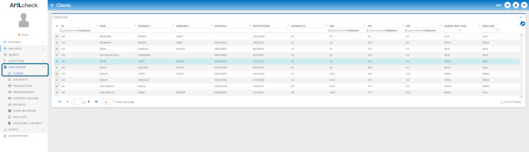 - AMLcheck helps users understand who their customers are (KYC): following main global AML regulations, such as FATF, FinCEN and the Fourth Anti-Money Laundering Directive of the EU, AMLcheck permits a detailed analysis of clients to assign them a risk score or RBA. This score is alive and is constantly updated in real time through top global information providers.
