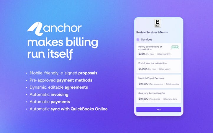 Payments are processed automatically according to agreement schedules, and the system performs automatic reconciliation with QuickBooks Online, eliminating the need for manual cross-referencing. The platform offers comprehensive functionality including customizable proposals, agreements that evolve with changing work scopes, and support for various billing models including fixed, hourly, recurring, and one-time charges. Anchor accepts payments via ACH or credit card with configurable processing fee allocation.