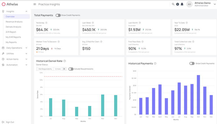 Athelas RCM (revenue cycle management) is a medical billing and revenue management software designed for healthcare practices. It automates the revenue cycle, manages patient intake, extracts data and handles claims submission and denial management. Athelas RCM integrates with over several EMR (electronic medical record) systems, offering real-time financial visibility through dashboards and reporting tool. The AI-based rules engine also allows practices to customize billing rules and business processes to support their unique needs.
