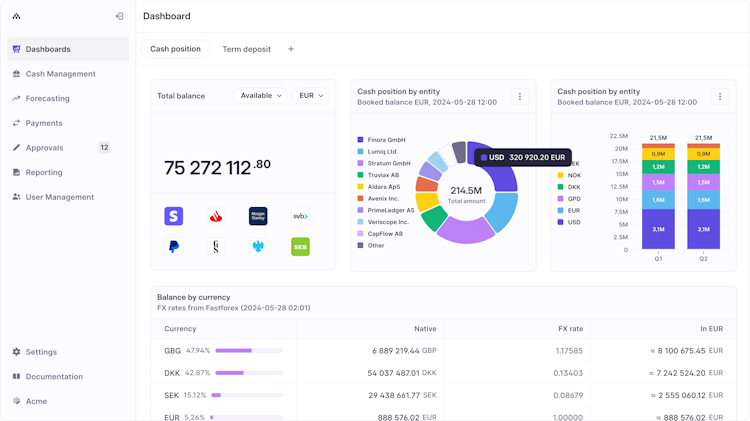 Cash management functionality aggregates real-time position data across all corporate accounts to eliminate the need for multiple banking portals. The payments module enforces enterprise-grade controls, role-based permissions, fraud detection, and multi-level approval workflows to secure payment execution. Automated cash forecasting draws directly from integrated enterprise resource planning systems to generate adaptive forecasts based on historical transaction patterns. Intelligent reconciliation algorithms match, verify, and close bank statements across all relationships and legal entities without manual intervention. Investment management capabilities enable treasury teams to deploy excess liquidity into deposits or investment funds while maintaining visibility into exposures and maturity schedules. The debt management component tracks credit facilities, key dates, and covenant compliance to support capital planning and risk management.