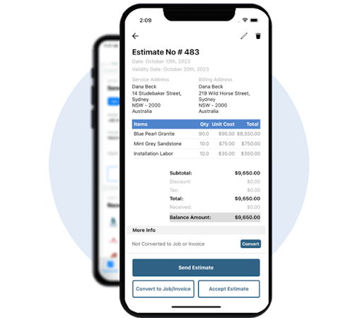 - Estimates: Create professional estimates in minutes. Add line items, adjust pricing, apply taxes, and send polished quotes your customers can approve with a tap. Customers can also sign the invoice. Turn approved estimates into scheduled jobs or invoices with one click.