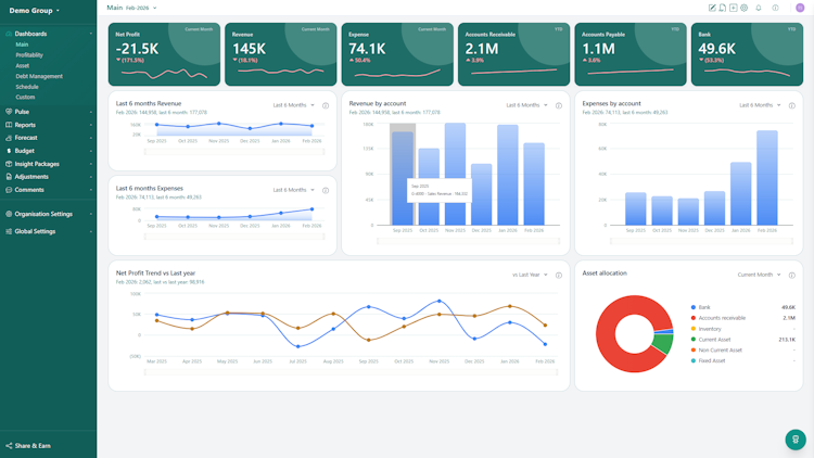The platform integrates directly with Xero, QuickBooks, MYOB, and Zoho Books, syncing data daily with no manual imports. A visual organisation hierarchy lets you manage complex group structures with drag-and-drop simplicity, while Virtual Groups allow custom business-line or regional views without disrupting the statutory structure.