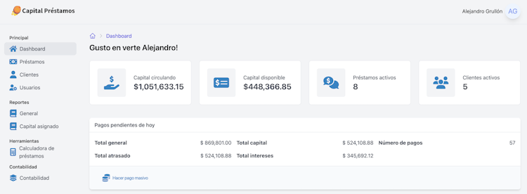 Capital Prestamos is a comprehensive system designed specifically for lenders and financial institutions. The platform automates the entire loan management process, from application to collection, providing a seamless and efficient solution.