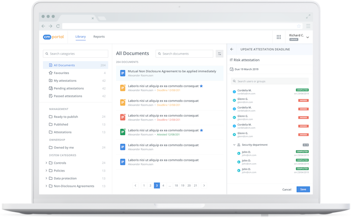 ClauseMatch tracks policy statuses and procedures and sends notifications to staff members about any changes that might breach the regulatory compliance of the organization. The policy portal helps users grant staff members with role-based access to updated versions of procedures and policies, display information using tagging capabilities, and manage educational content including training videos, Q&As, and more.