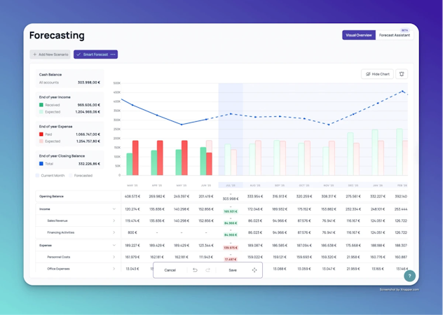For strategic planning, the system offers Multi-Scenario Forecasting, enabling users to model various growth strategies, run "what-if" scenarios, and track multiple financial plans simultaneously to compare potential outcomes. Crucially, it moves beyond simple reporting with Action-Based Recommendations, providing specific "Save Now" suggestions complete with dollar impact estimates, facilitating immediate, measurable action.