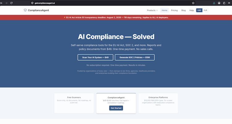 EU AI Act Compliance Scanner ($49 one-time): 12-section compliance report with risk classification, obligation mapping, remediation roadmap, and deadline calendar. EU AI Act Article 50 transparency obligations take effect August 2, 2026. Penalties under the EU AI Act reach up to 7% of global annual turnover. SOC 2 Policy Document Generator ($199 one-time): Nine board-ready policy documents cross-mapped to ISO 27001, NIST CSF, and CIS Controls. Bundle both for $229.