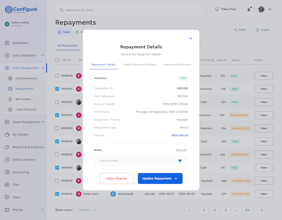 Configure provides in-depth reporting and analytics tools to monitor key performance indicators, track loan portfolio performance, identify trends, and make data-driven decisions.