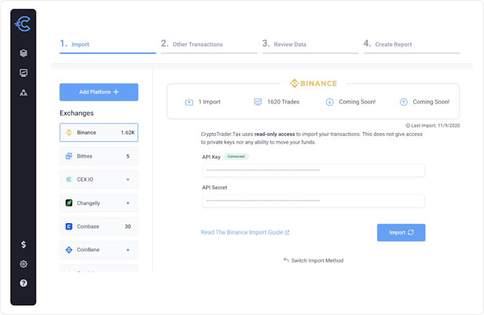 For tax preparation, users are able to export tax forms to any preferred filing software such as TaxAct, TurboTax, HR Block, and more. On the other hand, CryptoTrader can easily import transaction reports from Binance, Coinbase, Uniswap, Kraken, CashApp, crypto.com, Blockfi, and plenty more.