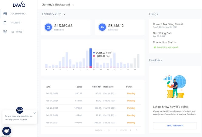 With DAVO sales tax is one less thing to worry about. DAVO Sales Tax automatically sets your sales tax aside daily using sales data from your POS. When it's time to file with the State, DAVO automatically files and pays your sales tax on time and in full. Guaranteed.