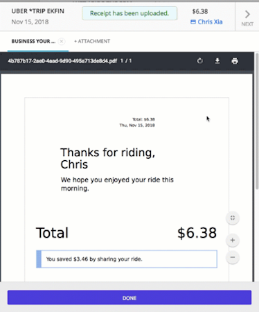 • Emburse Cards automatically scans users’ Google inbox to look for the corresponding receipt for a transaction.
