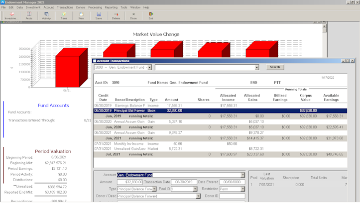 Manage single or multiple investment pools with varying distribution rules for shares, income, gains and spending. It provides complete audited tracking for distribution of all funds and helps users synchronize data with existing General Ledger, Development, Accounts Payable and Investment Systems.