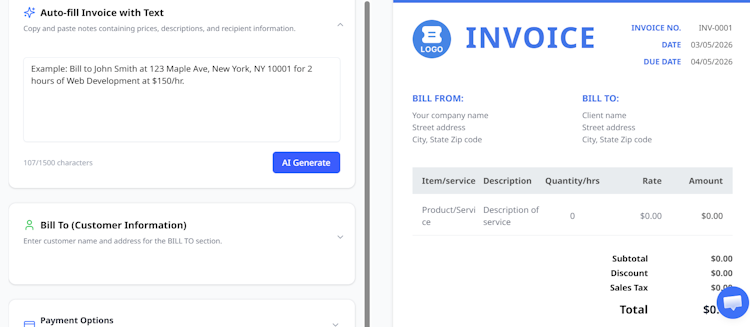 * AI Intelligent Parsing — converts text, emails, or messages into structured invoices automatically