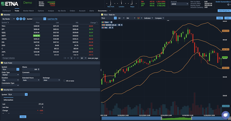 ETNA Web Trader offers API-based integration, enabling developers to connect the system with third-party trading tools and create custom interfaces. Brokers can use the probability analytics calculator to predict the outcome of investment projects by setting up multiple target prices and adjusting for expiration dates. The solution also provides a range of indicators such as Bollinger Bands, MACD, and stochastic oscillators, which let users view market trends and price flows.