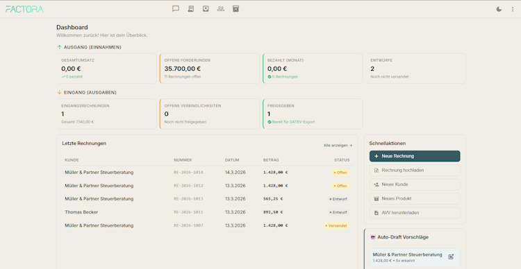 Factora is electronic invoicing software designed specifically for German small and medium sized enterprises. The platform automates creation of XRechnung and ZUGFeRD format invoices in accordance with German electronic invoicing regulations. It addresses the mandatory requirements for receiving electronic invoices that took effect in January two thousand twenty five and the obligations to send electronic invoices from January two thousand twenty seven. The solution is available as a cloud service hosted on servers in Frankfurt and supports GDPR compliant data processing and GoBD conformant archiving.