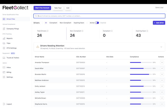 FleetCollect is a driver qualification file management software designed to support motor carriers in maintaining compliance with Federal Motor Carrier Safety Administration regulations. The platform serves as a centralized compliance system for trucking companies, fleet managers, and commercial motor carriers subject to Title Forty Nine Code of Federal Regulations Part Three Hundred Ninety One point fifty one requirements for driver personnel files. FleetCollect accommodates operations of all sizes, from owner operators overseeing a single driver to enterprises managing extensive driver rosters. The platform provides a digital alternative to paper based filing systems and spreadsheet tracking methods.