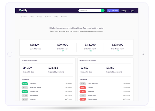Fluidly is a cloud-based cashflow management solution which uses cloud accounting software data and AI to automate credit control, and optimize and protect cashflow for SMEs. Fluidly applies machine learning to transaction data from cloud accounting packages and bank accounts to provides control, certainty and confidence around cashflow.